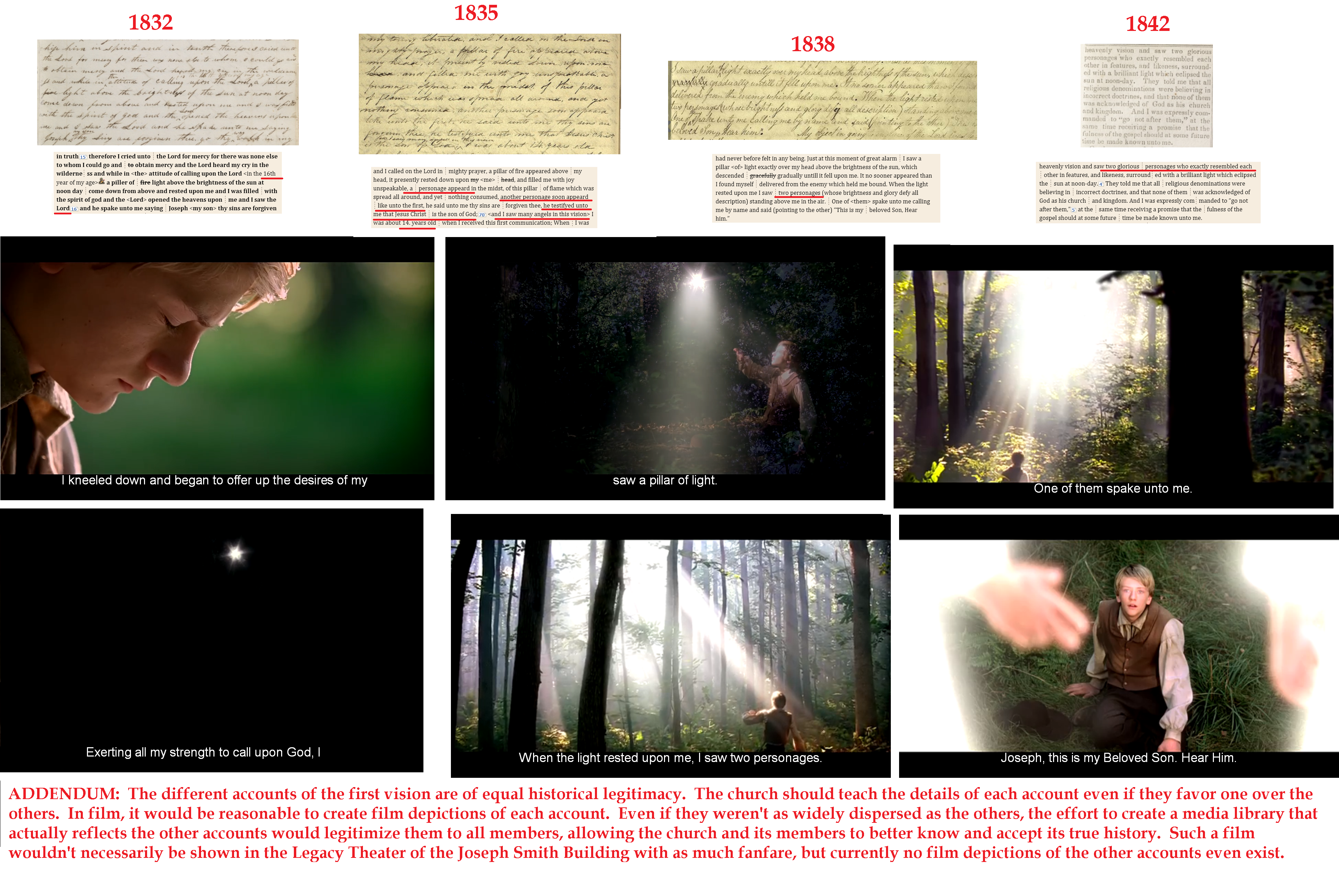 ADDENDUM: The different accounts of the first vision are of equal historical legitimacy. The church should teach the details of each account even if they favor one over the others. In film, it would be reasonable to create film depictions of each account. Even if they weren’t as widely dispersed as the others, the effort to create a media library that actually reflect the other accounts would legitimate them to all members, allowing the church and its members to better know and accept its true history. such a film wouldn’t necessarily be shown in the Legacy Theater of the Joseph Smith Memorial Building with as much fanfare, but currently no film depictions of the other accounts even exist.